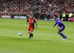 On 19 January 2015, Giovinco signed with Canadian team Toronto FC of Major League Soccer (MLS).[54] He was set to join the team upon the completion of the Serie A season in July 2015. He signed a five-year contract with a reported annual salary of $7 million, making him the highest paid player in MLS ahead of Orlando City SC's Kaká,[55] and the highest paid Italian player in all leagues.[56] On 2 February, Juventus announced that Giovinco had left the club five months earlier than originally expected in order to kick-start his career in MLS with Toronto FC.[57] Giovinco made his debut for Toronto FC against Vancouver Whitecaps FC on 7 March.[58] He provided an assist for Jozy Altidore's equalising goal in the 32nd minute. He scored his first goal for Toronto FC on 4 April, in a 3–2 loss to Chicago Fire, also later setting up Benoît Cheyrou's goal.[59] On 13 May, Giovinco scored and assisted a goal in a 3–2 home win over Montreal Impact in the return leg of the 2015 Canadian Championship semi-finals, although Montreal progressed to the final on away goals, having won the home leg 1–0.[60] After setting up two goals in TFC's 3–1 home win over San José on 30 May, Giovinco was voted Major League Soccer Player of the Week by the North American Soccer Reporters, for week 13 of the 2015 MLS season.[61] Following his two goals in Toronto FC's 2–1 away win over D.C. United, he was named MLS Player of the Week for a second consecutive time the following week.[62]