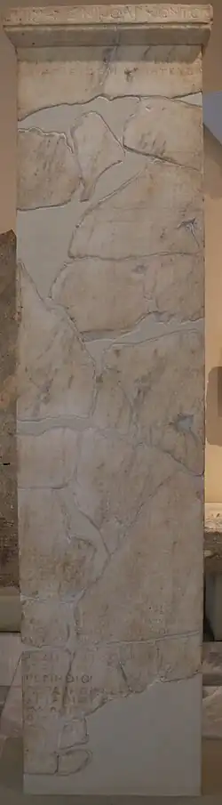 An inscribed prospectus for the League was found at Athens dating to 377 BC, detailing the aims of the new league. The terms of the league were as follows: meetings would be held in Athens, but every city would enjoy one vote no matter its size and would retain its independence.[22] Unlike the terms of the Delian League, these terms did not include forced garrisons or tribute, and Athenian citizens were prohibited from owning property in other member states. Athens framed these terms as a departure from those of the Delian League, which had been unpopular among tribute states due to the ruthlessness of Athenian hegemony and the harsh punishments against states that rebelled. Athens also convinced foreign powers, including Sparta and Persia, that the charter was a way to enforce the Peace of Antalcidas instead of a subversion of it.
