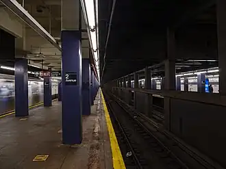The trackside walls have a medium Parma violet trim line with a slightly darker border, and small tile captions reading "2ND AVE" in white on black run below it at regular intervals. The platform columns are concrete and painted indigo, and there are especially large columns with built-in benches at the centers of the platforms. Despite the station's name, the exit and mezzanine at Second Avenue is only open part-time. The full-time booth is located at the First Avenue mezzanine. The station previously had a full-length mezzanine. However, most of the mezzanine was closed, and the closed areas currently hold offices while the rest are used for storage space.