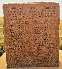 The Second Battle of Adobe Walls was fought on June 27, 1874, between Comanche forces and a group of 28 Texan bison hunters defending the settlement of Adobe Walls, in what is now Hutchinson County, Texas. "Adobe Walls was scarcely more than a lone island in the vast sea of the Great Plains, a solitary refuge uncharted and practically unknown."[1]: 225