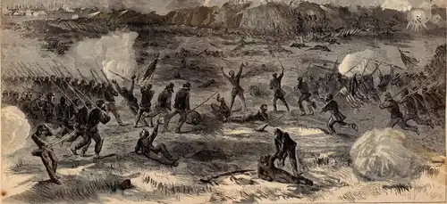 The attack, however, drew Confederate attention away from the river gate, where Ames prepared to launch his attack. At 2:00 PM he sent forward his first brigade, under the command of Brevet Brigadier Newton Martin Curtis, as Ames waited with the brigades of Colonels Galusha Pennypacker and Louis Bell. An advance guard from Curtis's brigade used axes to cut through the palisades and abatis. Curtis's brigade took heavy casualties as it overran the outer works and stormed the first traverse. At this point Ames ordered Pennypacker's brigade forward, which he accompanied into the fort. As Ames marched forward, Confederate snipers zeroed in on his party, and cut down a number of his aides from around him. Pennypacker's men fought their way through the riverside gate, and Ames ordered a portion of his men to fortify a position within the interior of the fort. Meanwhile, the Confederates turned the cannons in Battery Buchanan at the southern tip of the peninsula and fired on the northern wall as it fell into Union hands. Ames observed that Curtis's lead units had become stalled at the fourth traverse, and he ordered forward Bell's brigade, but Bell was killed by sharpshooters before ever reaching the fort.[21] Seeing the Union attackers crowd into the breach and interior, Whiting took the opportunity to personally lead a counterattack. Charging into the Union soldiers, Whiting received multiple demands to surrender, and when he refused he was shot down, severely wounded.[22]
