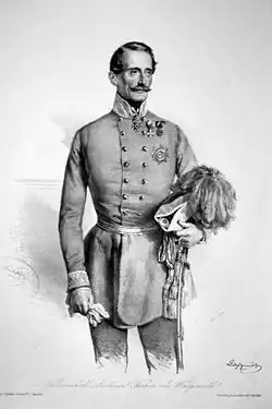 The imperial infantry relied on muzzleloaders; although the more-modern breechloaders were in use by the Prussian Army, the army commandant considered them inaccurate and wasteful of ammunition.[31] The infantry primarily used Augustin M 1842 muskets, with an effective range of 250 meters and 75-percent accuracy to 100 paces.[30] Another weapon used by the Austrian army was the 1842M kammerlader smoothbore rifled musket, which was more accurate and had a longer range than the M 1842. The light infantry was equipped with short-barrel hunting rifles, which were more accurate and reliable than the long-barrelled rifles also used.[30] The imperial cavalry used the 1844 M short, smooth-barrelled cavalry percussion carbine, which was effective to 50 paces. Although it used handguns in close combat, but its main weapons were swords and sabers.[30] Morale was high before the battle, due to Haynau's victories and the presence of young Franz Joseph I and the Archdukes Ferdinand Maximilian and Karl Ludwig in the camp.[30][32]