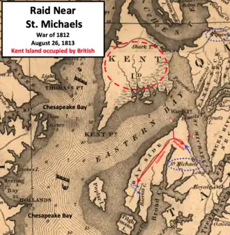 The British captured Maryland's Kent Island during early August 1813. The island is located north of St. Michaels and across the bay from the Maryland state capital, Annapolis. The British landed about 3,000 men on the island, but faced no resistance because most of the inhabitants fled when they learned of the invasion.[23][Note 4] The island had food and fresh water, and provided a base for operations against Maryland's Eastern Shore, Annapolis, Baltimore, and Washington.[25] The town of Easton, the largest city on Maryland's Eastern Shore, was also a potential target.[26]