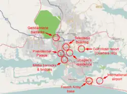 The fighting in Abidjan has been concentrated in two areas in the suburb of Cocody – around the state television building, which went off the air on the evening of 31 March, and around the residence of Laurent Gbagbo, where pro-Gbagbo Republican Guard members and armed students were said to be putting up strong resistance.[47] Gunfire and shelling was also reported around the presidential palace in the central Plateau district of the city.[38] Fighting also broke out in the Treichville district, where Gbagbo's Republican Guard was defending the city's main bridges, and around the gendarmerie base at Agban.[42]