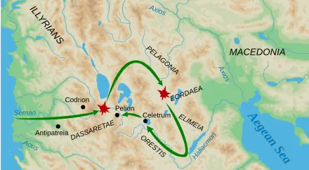 In the spring of 199 BC, Sulpicius led his troops east through the territory of the Dassaretii, an Illyrian tribe that occupied the area bordering western Macedonia.[14] Philip gathered 20,000 infantry and 4,000 cavalry, recalling the troops he had stationed in the north with Perseus, and marched west. He encamped on a hill near Athacus which overlooked Sulpicius' camp. After a series of indecisive skirmishes (in one of which Philip was nearly captured), news came that the Dardanians had invaded northern Macedonia, and the Macedonians withdrew secretly in the night.[15] When he realised what had happened, Sulpicius set out in pursuit through Pelagonia, found Philip blocking the pass to Eordaea and forced it. Sulpicius ravaged Eordaea, then Elimeia to the south, and then followed the Haliacmon river valley up to Orestis, where he conquered Celetrum and Pelion and then returned to his base.[16] Philip split his force, sending a contingent of his army north to deal with the Dardanian invasion, which it did, while he himself headed south.