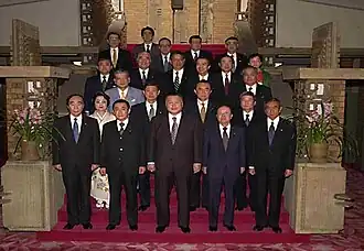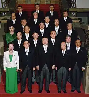 ![]() Prime Minister Yoshirō Mori (front row, centre) with the re-elected cabinet inside the Kantei, July 4, 2000 | |