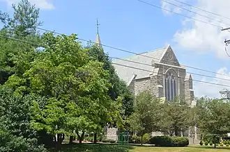The Second Presbyterian Church is a historic Presbyterian church located at 460 E. Main Street in Lexington, Kentucky. Construction began on the church in 1922, and it was dedicated in 1924; it was the third building used by its congregation, which was founded in the 1810s.[2] Architects Cram & Ferguson designed the Gothic Revival church; Frankel & Curtis are also associated with the building. The church's main entrance features multiple gabled buttresses, a balcony under a large arched window, and a gable at its peak. On the west side of the church, a buttressed tower rises from the roof to a steep spire.[3]
