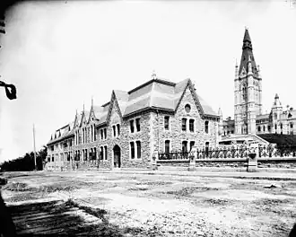 In 1882, the Supreme Court of Canada moved into permanent accommodations in the refurbished building located at the southwest corner of the West Block on Parliament Hill, facing Bank Street.[2] Originally constructed in 1873 as workshops and stables for the government, the building was designed by Chief Dominion Architect Thomas Seaton Scott. It was renovated in 1881 by Thomas Fuller for use by the Supreme Court. From 1882 until 1887, the Court shared the building with the National Art Gallery.[3] Despite its new home, members of the Court made numerous complaints about the facility, including a persistent "dreadful smell", poor ventilation, cramped space, a lack of offices, and its inconvenient distance from the Library of Parliament.[3]