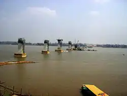 Bridge construction began on 21 March 2004. Supports and spans were constructed on shore, then moved out onto pylons in the river by crane.