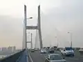 The Second Wuhan Yangtze River Bridge (Chinese: 武汉长江二桥, Wuhan Changjiang Er Qiao) is a bridge across the Yangtze River in Wuhan, Hubei province, China. It is located northeast (downstream) of the historic central area of the city's Hankou District and is the northern crossing for the Inner Ring Road. It is a cable-stayed bridge built of pre-stressed concrete, and has a central span of 400 metres (1,300 ft).[1] It is 4.678 kilometres (2.907 mi) in length (including the 1,876-metre (6,155 ft) main span) and is 26 metres (85 ft) wide. Its main bridgeheads are 90 metres (300 ft) high each, pulling 392 thick slanting cables together in the shape of double fans, so that the central span of the bridge is well-balanced on the piers and the bridge's stability and vibration resistance are ensured.