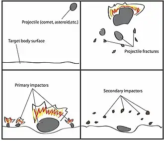 When a velocity-driven extraterrestrial object impacts a relatively stationary body, an impact crater forms. Initial crater(s) to form from the collision are known as primary craters or impact craters. Material expelled from primary craters may form secondary craters (secondaries) under a few conditions:[2]