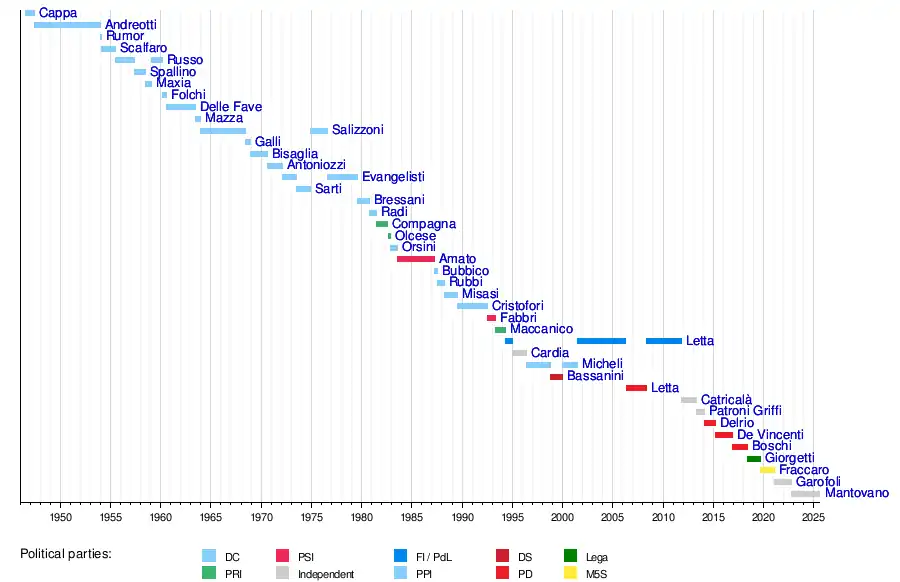 31 May 1947 | 18 January 1954 | 6 years, 232 days | Christian Democracy | De Gasperi IV·V·VI·VII·VIII Pella |