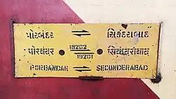 The 20967 / 20968 Secunderabad–Porbandar Weekly Express is an Express train belonging to Western Railway zone that runs between Secunderabad Junction and Porbandar in India. It is currently being operated with 20967/20968 train numbers on a weekly basis.[1][2]