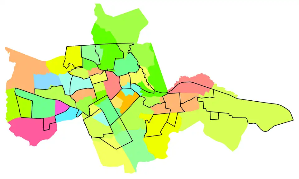 In 1982, the district had its first official division in bairros,[5] in 1986 are made small changes.[6] However, it was created detached bairros before 1982, like is the case of Bairro Roberto Holtermann that was created in 1961,[7] and nowadays is part of the Nossa Senhora de Fátima neighbourhood with the name of Vila Holtermann.