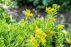 A succulent herb with a fibrous root system.[2] The entire plant is smooth in texture, with the lower part of the plant creeping and the upper part leaning or nearly erect, reaching a height of approximately 6 to 12 cm (2.4 to 4.7 in).[2][3] The leaves are spatulate or slightly rhomboid, with entire leaf margins, with a slightly protruding or short-pointed apex. The leaves are arranged alternately and are approximately 10 to 25 mm (0.39 to 0.98 in) in length and 4 to 6 mm (0.16 to 0.24 in) in width.[2][3] The inflorescence is a scorpioid cyme composed of basic units of cymes. The flowers are sessile and arranged closely together, with a distance of only approximately 5 mm (0.20 in) between each flower.[2][3] The calyx is green with five sepals usually in varying sizes that are approximately 2.8 to 4 mm (0.11 to 0.16 in) in length and 0.9 mm (0.035 in) in width, spathulate, free at the base and spurred; they remain in a horizontal position when the fruit is ripe. The corolla is bright yellow with five elliptic-lanceolate-shaped petals.[2][3] The stamens are arranged in two whorls of ten, with the outer whorl located between the petals and the filaments fused at the base with the adjacent petal bases. The inner whorl is opposite to the petals, with the filaments fused to the central base of the petals.[2][3] The pistil is composed of five carpels that are generally free and partially fused at the base. Each flower typically produces five follicles that are arranged in a star-shaped pattern at the apex of the stem.[2][3]