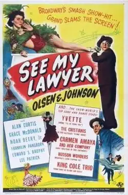 See My Lawyer is a 1945 American comedy film directed by Edward F. Cline and written by Edmund Hartmann and Stanley Davis. It is based on the 1939 musical See My Lawyer by Richard Maibaum and Harry Clork.[1] The film stars Ole Olsen, Chic Johnson, Alan Curtis, Grace McDonald, Noah Beery Jr., Franklin Pangborn and Edward Brophy. The film was released on March 9, 1945, by Universal Pictures.[2][3][4]