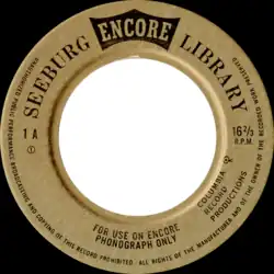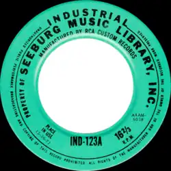 A Seeburg Background Music record is a vinyl record of a non-standard 9 inch (23 cm)-diameter size with a 2-inch (5 cm) center hole. The recording is monaural, with a playing speed of 16+2⁄3 rpm and a density of 420 grooves per inch.[2] A 0.5 mil diamond stylus is used for reproduction. Each side contains approximately 40 minutes of music (typically 20 songs). Records in each series were numbered 1-25 from 1959 to the July 1st 1966 set, and 101-128 from the October 1st 1966 set all the way to the last set. These numbers meant nothing other than an indication as to where a record belonged in the stack order.