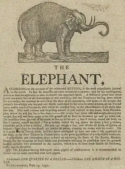 The fixed exhibition had gained such renown that, in 1808, Hachaliah Bailey purchased "Old Bet"[6] from Crowninshield for one thousand dollars; and while this was a steep price tag, the hefty returns on his purchase allowed him to later invest in more animals.[7] Old Bet traveled extensively with Bailey charging 25 cents for the curious to "see" the elephant.[8]