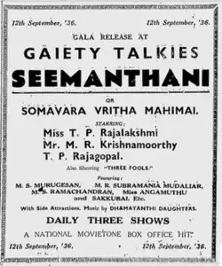 - ^ "Blast from the past: Seemanthani (1938)". The Hindu. 8 October 2011. Retrieved 13 June 2024.
