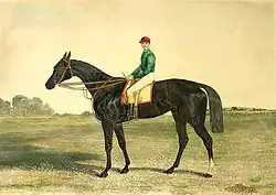 Sefton, a dark-coated bay horse with one white sock,[2] was bred by Jonathan Peel[3] at the Glasgow Stud (owned by James Carr-Boyle, 5th Earl of Glasgow) at Enfield, Middlesex. As a yearling was sold for 1,000 guineas[4] to William Stuart Stirling-Crawfurd (1819–1883) of Milton[5] in Lanarkshire, Scotland (now a suburb of Glasgow), an "old school" sportsman[6] who had married the widow of the Duke of Montrose. Sefton was trained at Manton by Alec Taylor Sr., who had established his training facility there in 1870 under the patronage of Stirling-Crawfurd.[7]