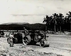 The Segi (Seghe) Point area was the base of the British Commonwealth coastwatcher, Donald Gilbert Kennedy, who had monitored Japanese shipping and aircraft (reporting by radio) and also rescued American airman who were shot down in the territory held by the Japanese. In May and June 1943 Japanese patrols moved into the Segi Point area. The Segi Point area was secured by the 4th Marine Raider Battalion on 30 June 1943 in the opening phase of the New Georgia Campaign. The 20th, 24th and 47th Naval Construction Battalions landed with the Marines and immediately began construction of a fighter airstrip. Bad weather and poor soil conditions delayed construction, but by 18 July a coral-surfaced 3,300 feet (1,000 m) by 150 feet (46 m) runway was ready for use.[1] By the end of July taxiways and revetments had been completed. In August the runway was widened to 200 feet (61 m) and two 42,000 US gallons (160,000 L; 35,000 imp gal) gas tanks had been constructed and by September, 52 hardstands had been completed.[1]: 264