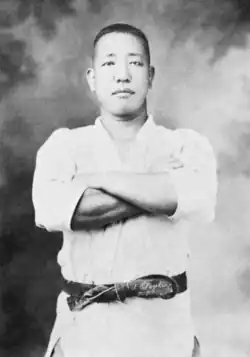 Born in Kakeda, Date County in Fukushima Prefecture, Japan, he immigrated to Hawaii in 1906.[a] At the age of 19 he learned he had tuberculosis. Through hard training in the martial arts, Okazaki recovered completely and vowed to dedicate his life to propagating jujutsu and judo. From 1927 to 1928, Okazaki developed a complete, integrated martial arts system: Danzan Ryu Jujutsu. A synthesis of several older styles of jujutsu, Okazaki included in the system elements of his studies of Judo, Okinawan karate, Chinese kung-fu, Hawaiian Lua, Filipino knife fighting (escrima), boxing and wrestling,[3] as well as traditional Japanese restorative massage and healing techniques (Seifukujutsu).[4]