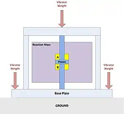 A seismic vibrator transforms the energy provided by a diesel engine into a vibration. It is performed by a shaker, a movable element that generates the vibration thanks to a piston-reaction mass device driven by an electrohydraulic servo valve. The shaker is applied to the ground for each vibration, then raised up so that the seismic vibrator can move to another vibrating point.[4]
