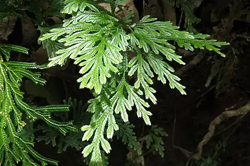 Selaginella longipinna, commonly known as the electric fern, is a plant in the spike moss family Selaginellaceae. It is endemic to northeastern Queensland, growing in rainforest and closed forest from Cooktown to near Mission Beach, including the Atherton Tablelands. It is a terrestrial plant forming a dense cover to 40 cm (16 in) high, often near streams.[4][5]