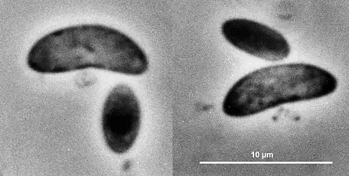 The most morphologically interesting members of the selenomonads are undoubtedly the large motile crescents found in the warm anaerobic nutrient-rich microecosystem provided by ruminant rumen, guinea-pig caecum (S. palpitans) and even pockets in the human gingiva (S. sputigena). In the illustrated atlas of sheep rumen organisms of Moir and Masson their organisms nos. 4 and 5 represent two forms of the large Selenomonads.[10] These crescents live only a short time under the light microscope but during that time display a remarkable "tumbling" motion produced by one (or two—during cell division) flagella emanating from a refractile basal body on the concave side, which was first described by Woodcock & LaPage, studied later by Lessel & Breed (with photomicrographic addendum from C. F. Robinow),[11] then by Jeynes, who (mistakenly) interpreted it as a "blepharoplast".[12][13]