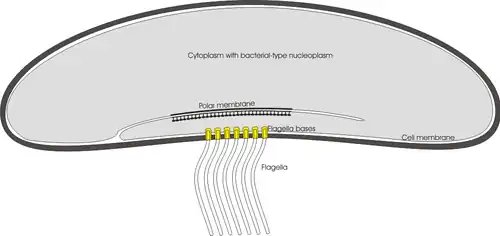 Years later, preparations of native rumen contents were examined for the first time by transmission electron microscopy of thin sections, negative stains and freeze-fracture replicas.[14][15] and many of the reasons for previous confusion were clarified. The "flagellum" was found to be quite unrelated to the flagellum of ciliate protozoa, instead consisting of a "fascicle" of numerous bacterial-type flagella (each displaying 11-fold subunit symmetry), twisted just outside the cell body into helical bundles to form strong organs of propulsion. The large crescents (which are better described as "bean-shaped") have flagella which are quite differently inserted into the concave side of the cell from those of the smaller species of Selenomonas. The small selenomonads have a rather low number of individual flagella inserted in a longitudinal row along the concave side whereas the large selenomonads have a much larger number, inserted into a circular patch of the cell membrane in the concave side in a close-packed (hexagonal) pattern, each flagellum inserted into a bullet-shaped structure at the cell membrane. Another interesting feature is the refractile body located beneath the massive flagella bundle characterizing the large crescents. It is not related morphologically to the ciliate blepharoplast (a "9+2" centriole-related structure found in cryptogams such as cycads, Ginkgo biloba and algae e.g. Euglena and Chlamydomonas). This flagella-associated structure observed in the large selenomonad can perhaps best be described as a "basal sac" formed by an invagination (in-folding) of the "polar organelle" region of the bacterial cell membrane in the middle of the concave side of the organism so that it lies directly behind the flagella. It appears to be unique in prokaryotes so far examined since in other bacteria possessing polar organelles, the structure is situated beside and around the flagella insertion bases in the cell membrane, but never lying behind them in the cytoplasm as in the case of the large selenomonad. The large crescents, with their unique morphology, still present many puzzles in their systematics. It is already clear from ultrastructural features that the genus Selenomonas is most probably an artificial classification, bringing together possibly unrelated organisms, simply because of their common possession of crescent morphology and peculiar flagellar insertion location. Successful attempts to maintain the large crescents in continuous culture over short terms have been reported by Prins [16] but long term culturing has not been possible so far. Genetic sequencing of the large crescents should provide the essential information required to better understand and classify these organisms.