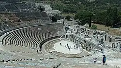 The entire structure, including the tiered seating carved into the natural slope, is constructed using red ceramic brick masonry. The architectural design ensures that performances on stage are both audibly and visually accessible from every point in the audience seating without the aid of artificial sound amplification or lighting systems.[2] An iron framework is installed above the central stage platform to facilitate the suspension of fabric coverings and lighting equipment as required.[1] The audience seating consists of 14 ascending tiers, accommodating up to 1,500 spectators simultaneously.[2]