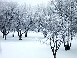 Due to Selkirk's position on the edge of the Canadian Prairies, there is a moderate 510.4 mm (20.1 inches) of precipitation annually.[10] Selkirk has a climate with four very distinct seasons. A general year will include warm (sometimes hot) summers, cold winters, and a comfortable spring and autumn. Selkirk has recorded a temperature as high as 38.5 °C (101.3 °F) in June 1995 and a temperature as low as −45.6 °C (−50.1 °F) in February 1966. Selkirk has 21 days with snowfall per year, from about November (sometimes as early as September or October) to around April (sometimes as late as May).[10]