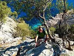 The Selvaggio Blu starts at Pedra Longa (40°1'38"N 9°42'25"E) and goes to Portu Pedrosu (40°4'5"N 9°44'2"E). It has an estimated travel time of 9 hours to cover its 12 km of length. In this stage it is reached the maximum height of all the Selvaggio Blu, which is 770 m. This section gets a climbing grade of EEA on the UAII Scale, which makes this stage the third hardest in technical difficulty of the entire journey.[4] The path crosses a small valley into the woods until it reaches a point where it is possible to see the sea. The path continues into another small valley with holm oaks, walking on very sharp limestone flakes. The path then crosses two gates, after which it descends toward the sea following the cliffs. Then, passing on the top of the Grotta dei Colombi, the path once again enters a small valley. Descending this valley, on the left there is a section equipped with juniper trunks that allow climbers to descend into Bacu Tenadili. The path at this point challenges the orientation skills of the climbers because of the lack of a GPS signal. After this section, there is a cracked limestone area where the shepherds are used to collecting water; after this the path becomes less clear. Following a steep zigzag, the path leads to the mooring of Portu Pedrosu were the first stage ends. Walking for 10 minutes more to Portu Cuau(40°5'11"N 9°43'55"E) there is a large space for camping[1]