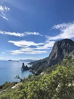 The Selvaggio Blu (Wild Blue) is a trekking route in the territory of the district of Baunei (Sardinia). It was conceived in 1987 by Mario Verin, (photographer and alpinist) and Peppino Cicalò (architect), President of the Nuoro section of the Italian Alpine Club. The itinerary extends for over 40 kilometers (approximately 25 miles) from the touristic port of Santa Maria Navarrese (Baunei) to the beach of Cala Sisine (Baunei).[1] It takes on average 4 days to complete.