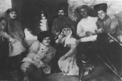 Upon Makhno's return from Russia in July 1918, Karetnyk and his brother attended a meeting with other local anarchists in order to figure out how they could acquire weapons.[3] They resolved to carry out surprise attacks against the local authorities, seizing 44,000 rubles in a bank robbery at Zherebets, and increasingly harassing the occupying Austro-Hungarian Army.[4] Despite earlier successes, the insurgents were driven out of the region by the occupation forces. They were surrounded by Hungarian forces at Temyrivka, where half of them were killed and Karetnyk himself was wounded.[5] They then regrouped at Orikhiv and on 27 November, they decisively retook Huliaipole.[6] Back in their hometown, the local anarchists established a general staff for the Insurgent Army, which Karetnyk joined.[7] On 20 December, Karetnyk led a detachment to Synelnykove, as part of a 300-to-500-strong insurgent battalion, and then on to Nyzhnyodiniprovske, arriving on Christmas.[8] The following day they attacked the city, capturing it from the Ukrainian People's Republic by 28 December.[9]