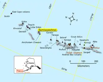 Semisopochnoi Island or Unyak Island (obsolete Russian: Семисопочной, modern Russian: Семисопочный Semisopochny – "having seven hills"; Aleut: Unyax̂[1]) is part of the Rat Islands group in the western Aleutian Islands of Alaska. The island is uninhabited and provides an important nesting area for maritime birds. The island is of volcanic origin, containing several volcanoes including Mount Young. It has a land area of 85.558 square miles (221.59 square km), measuring 11 miles (18 km) in length and 12 miles (20 km) in width.
