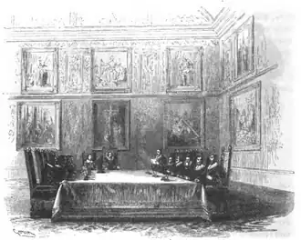 Francesco Sforza was supported in the actual governing of the city by an advisory council consisting of twelve individuals (formally called Tribunale di Provvisione). The Tribunale di Provvisione was assisted by three judges, tasked with overseeing specific aspects of public good. Francesco Sforza established also two other councils: the Privy Council (Consilium secretum), the supreme court of the Duchy of Milan, vested with important powers and even supposed to replace the Duke in his absence, and the Council of Justice (Consilium iustitiae), vested with technical attributions.[3] The members of both councils were appointed by the Duke and usually came from high-ranking families of the dominion. Galeazzo Maria Sforza expanded the powers of the Privy Council and doubled its membership from Duke Francesco's time.[4]