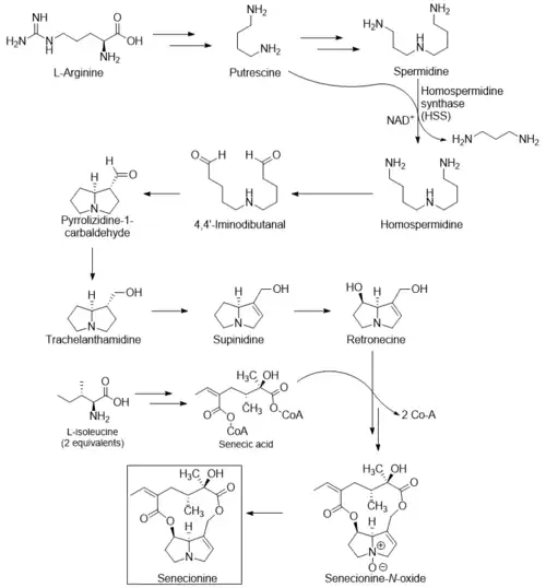 In Senecio species, biosynthesis of senecionine starts from L-arginine or L-ornithine.[8] Because plants don't have decarboxylase enzyme for L-ornithine, it must be first converted into L-arginine. Arginine can then be readily converted to putrescine and spermidine. Next, in an NAD+-dependent reaction catalyzed by homospermidine synthase (HSS), an aminopropyl group from putrescine is transferred to spermidine to form homospermidine, releasing 1,3-diaminopropane (see biosynthesis scheme).[9] HSS is the only enzyme that has been definitively implicated in this biosynthesis.[10]