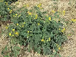 Senna planitiicola, commonly known as yellow pea, arsenic bush, ant bush or pepper-leaf senna,[2] is a species of flowering plant in the family Fabaceae and is endemic to northern Australia. It is an erect shrub with pinnate leaves with five to seven pairs of broadly elliptic to egg-shaped leaflets, and groups of three to eight yellow flowers on the ends of branches and in upper leaf axils.
