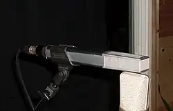 The microphone was introduced at the Hannover Fair in 1971.[7] From the 1970s onwards it could be seen in various television news programs, e.g. in Russia's main evening news program Vremya.[8] Four MD 441s are visible in Barbara Klemm's famous 1979 photo of the socialist fraternal kiss between Soviet general secretary Leonid Brezhnev and Erich Honecker.[9] The later Serbian President Slobodan Milošević spoke into six MD 441s at a large rally in Belgrade on 19 November 1988.[10] At the Alexanderplatz demonstration on 4 November 1989 in Berlin, the speeches were spoken into two MD 441s. On 19 December 1989, Helmut Kohl spoke into an MD 441 in Dresden at his first major appearance after the fall of the Berlin Wall.