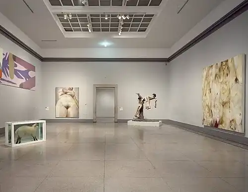 Sensation was an exhibition of the collection of contemporary art owned by Charles Saatchi, including many works by Young British Artists (YBAs), which first took place 18 September – 28 December 1997 at the Royal Academy of Arts in London.[1] The exhibition later toured to the Hamburger Bahnhof in Berlin and the Brooklyn Museum in New York City. A proposed showing at the National Gallery of Australia was cancelled when the gallery's director decided the exhibition was "too close to the market."