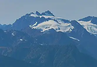 During the Pleistocene period dating back over two million years ago, glaciation advancing and retreating repeatedly scoured the landscape leaving deposits of rock debris.[5] The U-shaped cross section of the river valleys is a result of recent glaciation. Uplift and faulting in combination with glaciation have been the dominant processes which have created the tall peaks and deep valleys of the North Cascades area.