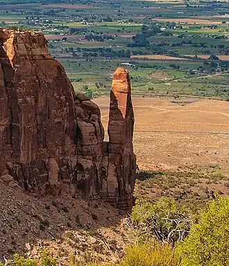 Sentinel Spire is a 5,500-foot-elevation (1,700-meter) sandstone pillar located in Colorado National Monument, in Mesa County of western Colorado, United States.[3] This 200-foot freestanding tower is situated in Wedding Canyon, one-half mile east of the monument's visitor center, and 9 miles (14 km) west of the community of Grand Junction.[5] It is also immediately south of Window Rock, and north of another climbing destination, Pipe Organ, both of which can be seen from viewpoints along Rim Rock Drive. The first ascent of the summit was made May 3, 1960, by Layton Kor, Harvey Carter, and John Auld via the class 5.10 route, Fast Draw.[6][7] This was the day before the climbers also made the first ascent of nearby Kissing Couple. The first solo ascent was made by Ron Olevsky in March 1976, and the first free ascent was made by Andy Petefish and John Christenson in 1978.[8] Some climbers refer to Sentinel Spire as Watusi Spear.[6]