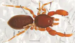 The genus was described as the oldest Palpimanoidea or the nearest sister taxon to the group.[5] The exact familiar placement of the genus is unclear, as it was assigned to the family based on the presence of peg teeth, a synapomorphy thought to be unique to the superfamily.[5] However, recent revisions of modern spiders have shown that this character is also present in the Mimetidae and other Entelegynae families.[5] Early araneomorphs such as those in the clade Synspermiata and the families Filistatidae, Austrochilidae and Leptonetidae lack it, locating the genus as either a stem Palpimanoidea or a stem Entelegynae.[5]