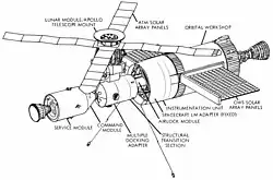 The AAP cluster as visualized by personnel of NASA's Office of Manned Space Flight in Washington in September 1968 - Wernher von Braun, Director of NASA's Marshall Space Flight Center (MSFC), ordered the first full test of the new pressure suits to be worn on Apollo missions. The test, made in the Neutral Buoyancy Simulator at the Saturn I workshop, showed that upgraded seals were "very good", but von Braun recommended additional handholds and tether points.[12]