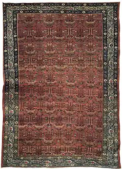 Seraband rug or Saraband, is an Iranian (Persian) handwoven floor rug from the Ser-e Band district (located southwest of Arak, Iran). These 19th-century and early-20th-century rugs have a "mir" design, characterized by small, pear or leaf forms in diagonal rows.