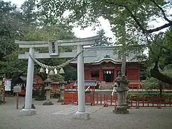 - The main shrine building (Honden), Worship Hall (Heiden) and Karamon gate were all former structures of the Oku-no-in of the Nikkō Tōshō-gū that were relocated to this site when the buildings erected by Tokugawa Hidetada were rebuilt by Tokugawa Iemitsu in 1644. The Honden is a one-bay Nagare-zukuri style structure with a copper roof. The Heiden is likewise an early Edo period (1615–1624) structure. It is a 3 × 5 bay Irimoya-zukuri style building with a copper roof. All three buildings were designated an National Important Cultural Property in 1956.[2][3][4]