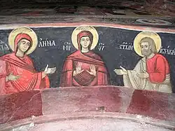 The fresco in the south wall, in the doorpost of the passage between the chapel of St. John the Baptist and the main church, painted in 1765, in which Joachim and Anna prayerfully address the Virgin, is an interesting and remarkable phenomenon in Serbian painting. The scene resembles the composition of Deisis, but the Virgin and her parents appear as protagonists.[4]