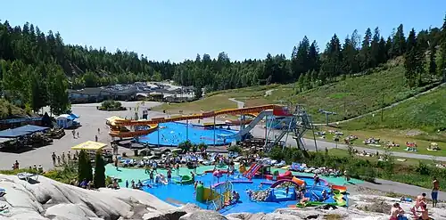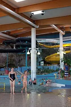 The water park features a variety of water slides, patios and hot tubs, children's pools and sparkling rapids, and the sauna departments are located in a part of the water park excavated inside the rock.[1] There are also restaurants and cafés in the area.[7] The Serena Ski Center is open in winter.[1] There are six cottages for rent all year round.[1][7]