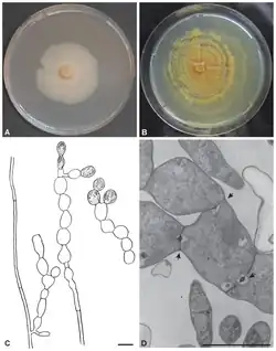 | Morphology of Serendipita herbamans: (A) Colony after two weeks of inoculation on MYP agar. (B) Colony after 6 months of inoculation on MYP agar. (C) Cylindrical and monilioid hyphae without clamps. Older monilioid hyphae become slightly yellow coloured. (D) Transmission electron micrographs showing monilioid hyphae with a septal porus at the constrictions (arrows). Scale bar C, D = 5 µm. | |